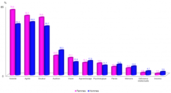- Les femmes souffrant d’incapacité sont plus nombreuses que les hommes à présenter les types d’incapacité suivants :